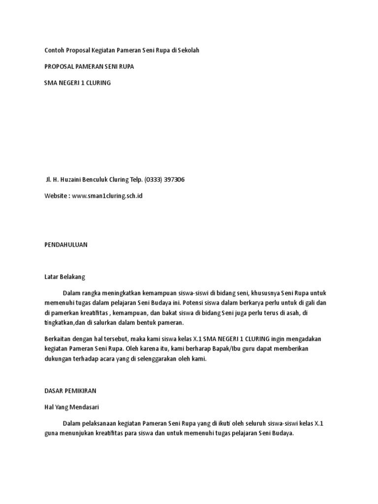 Contoh proposal kegiatan pameran seni rupa di sekolah banyak di antara kita yang masih tidak tau cara membuat sesuatu yang mungkin erlihat berkaitan dengan hal tersebut, maka kami siswa kelas x.1 sma negeri 1 cluring ingin mengadakan kegiatan pameran seni rupa. Proposal pameran seni rupa sma 233 jakarta. Proposal penelitian adalah salah satu jenis karya ilmiah yang bertujuan untuk mengusulkan proyek penelitian, baik dalam bidang sains maupun untuk kepentingan akademisi dan berharap agar sponsor mendanai. Perencanaan kegiatan dapat anda lakukan dengan membuat sebuah proposal. Proposal lazimnya dikenal sebagai sebuah dokumen yang berisi rencana kegiatan yang terancang secara sistematis dan terperinci.
